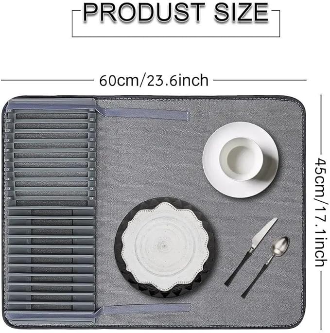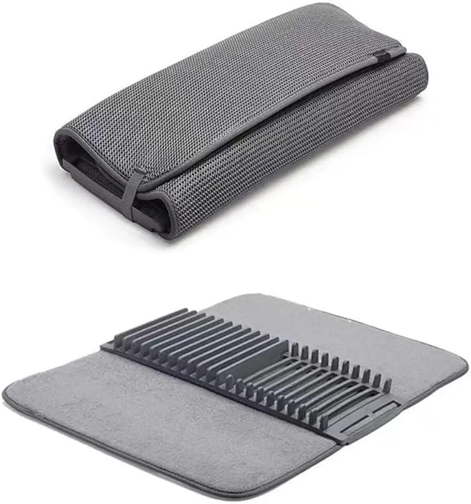 حامل تجفيف الصحون مع حصيرة 2 في 1 – حصيرة مايكروفايبر ماصة للمطبخ مع رف بلاستيك قابل للإزالة لتجفيف الصحون – منظم قابل للطي للأطباق، الأوعية والأدوات على سطح المطبخ.
