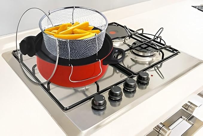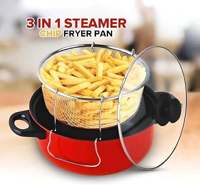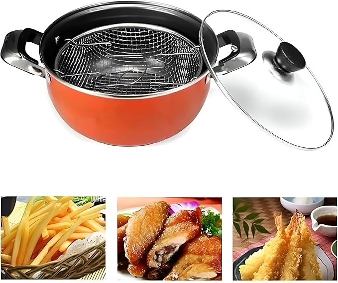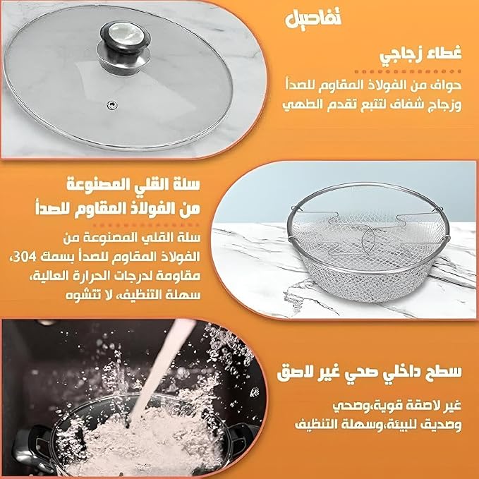طاسة قلي متعددة الاستخدامات بغطاء زجاجي مقاوم للحرارة ومقابض من الفولاذ المقاوم للصدأ بسلة شبكية لقلي البطاطس والدجاج والروبيان وغيرها