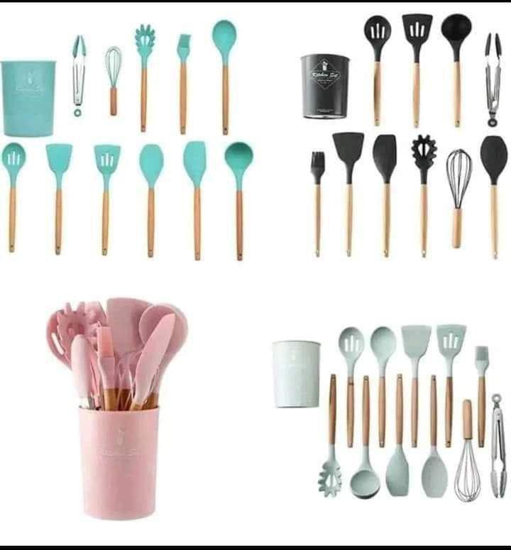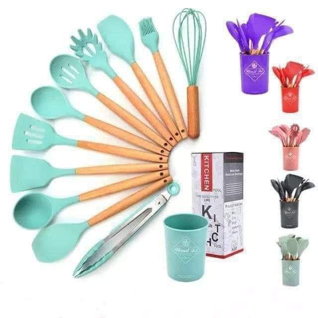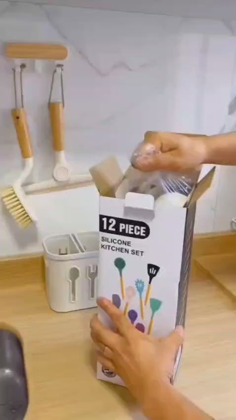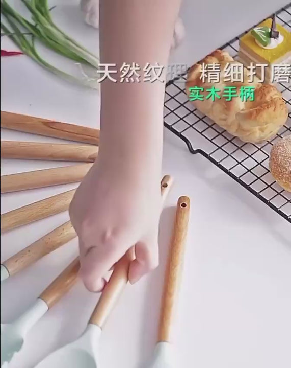طقم توزيع الشيف بوراك – 12 قطعة أنيقة وعملية، مثالي لكل مطبخ عصري. مصنوع من السيليكون الحراري بمقابض خشبية أنيقة، ويأتي مع استاند منظم.