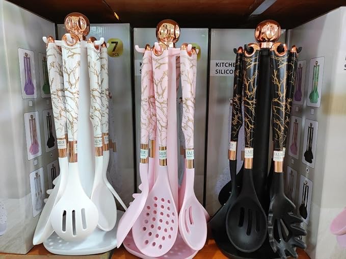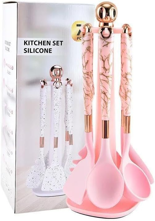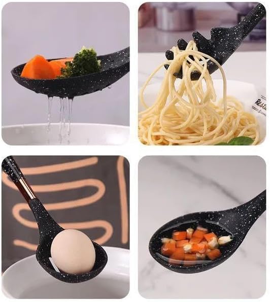 - طقم توزيع سيليكون الصحى 6 قطع بمقبض بلاستيكي عالي الجودة + حامل واحد مكون من (ملعقة كبيرة - ملعقة شوربة - ملعقة كبيرة مع فتحات فلتر - مغرفة مسطحة كبيرة - مغرفة مكرونة - مغرفة بفتحات فلتر)